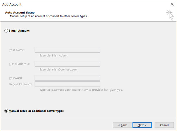 Step 3: In the Add New Account box choose Manual setup or additional server types > Next
